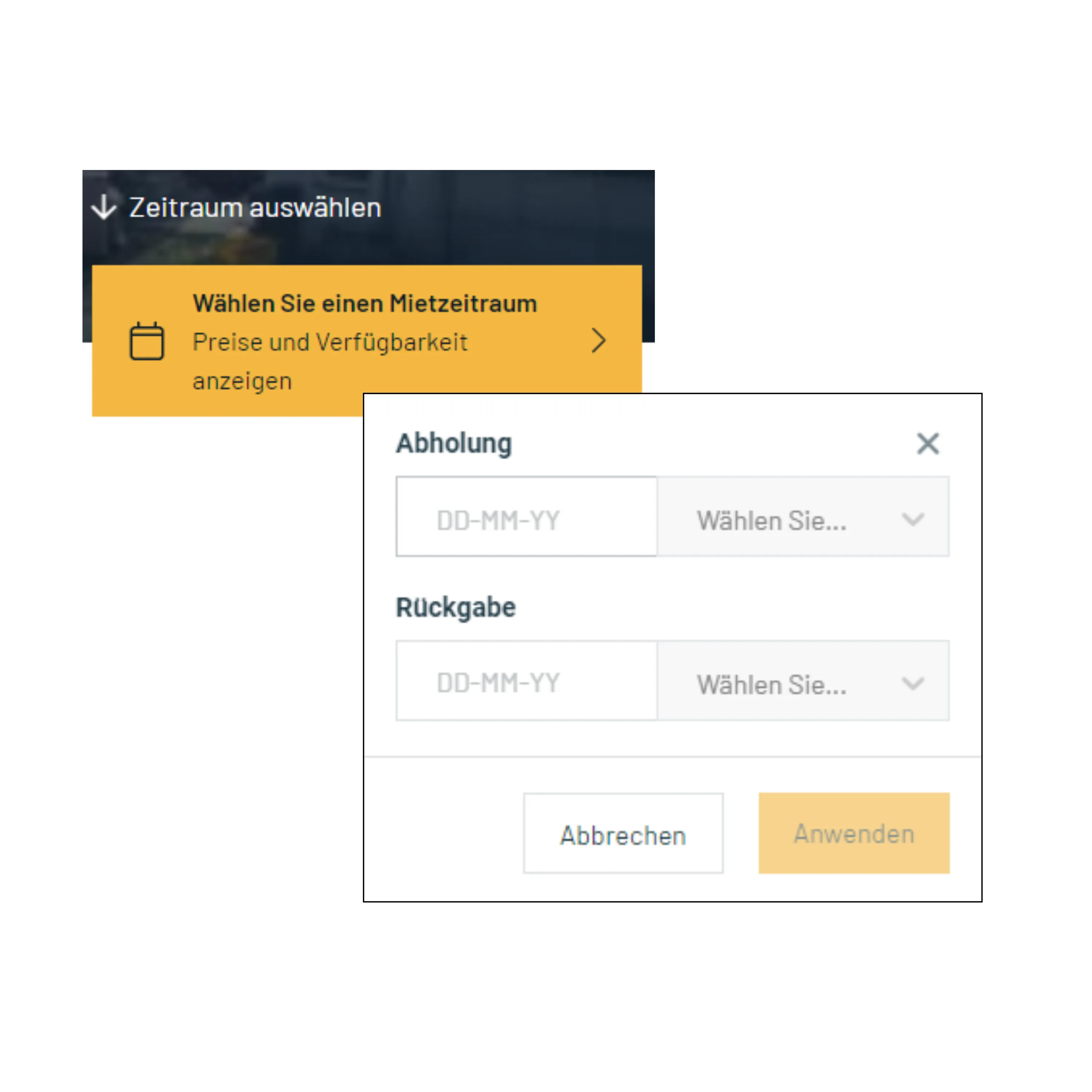 Wählen Sie den Mietzeitraum für Ihre Baugeräte aus. Dies ermöglicht es Ihnen, die Verfügbarkeit unserer Produkte zu überprüfen und sicherzustellen, dass sie mit Ihren geplanten Daten übereinstimmen